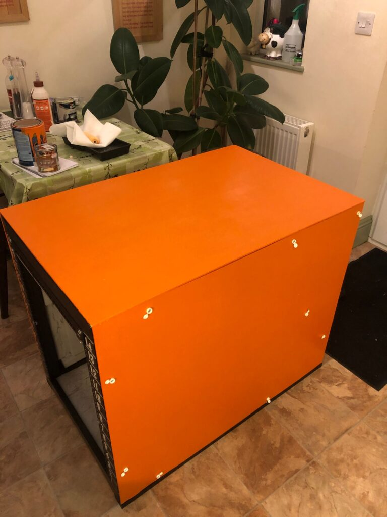 I wanted to paint the rack, and for some reason decided on the brightest colour I could find, and went with bright orange! I made a back for the unit and applied the foam in the same manner as to the sides.