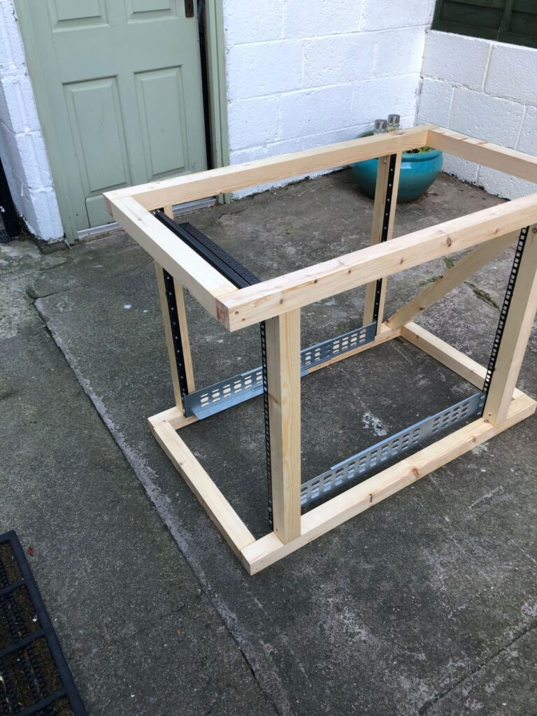 Using some spare wood that was lying about I started to make a frame out of 2″ x 2″ battens, the rack rails were placed 725mm apart to fit a full-length rack shelf I had. The overall length of the rack is just over 1000mm so its able to hold a full-length server. I removed the diagonal baton at the rear of the rack after the wood glue had completely dried.